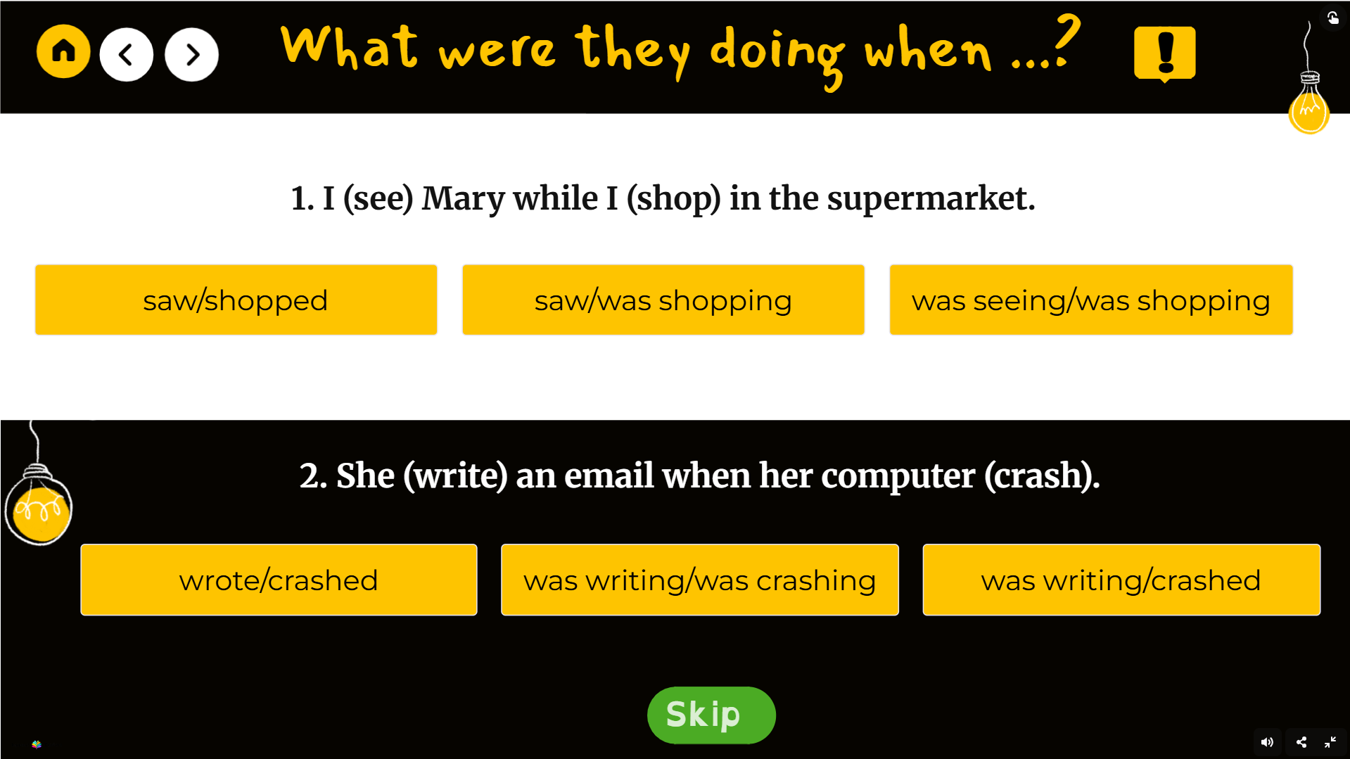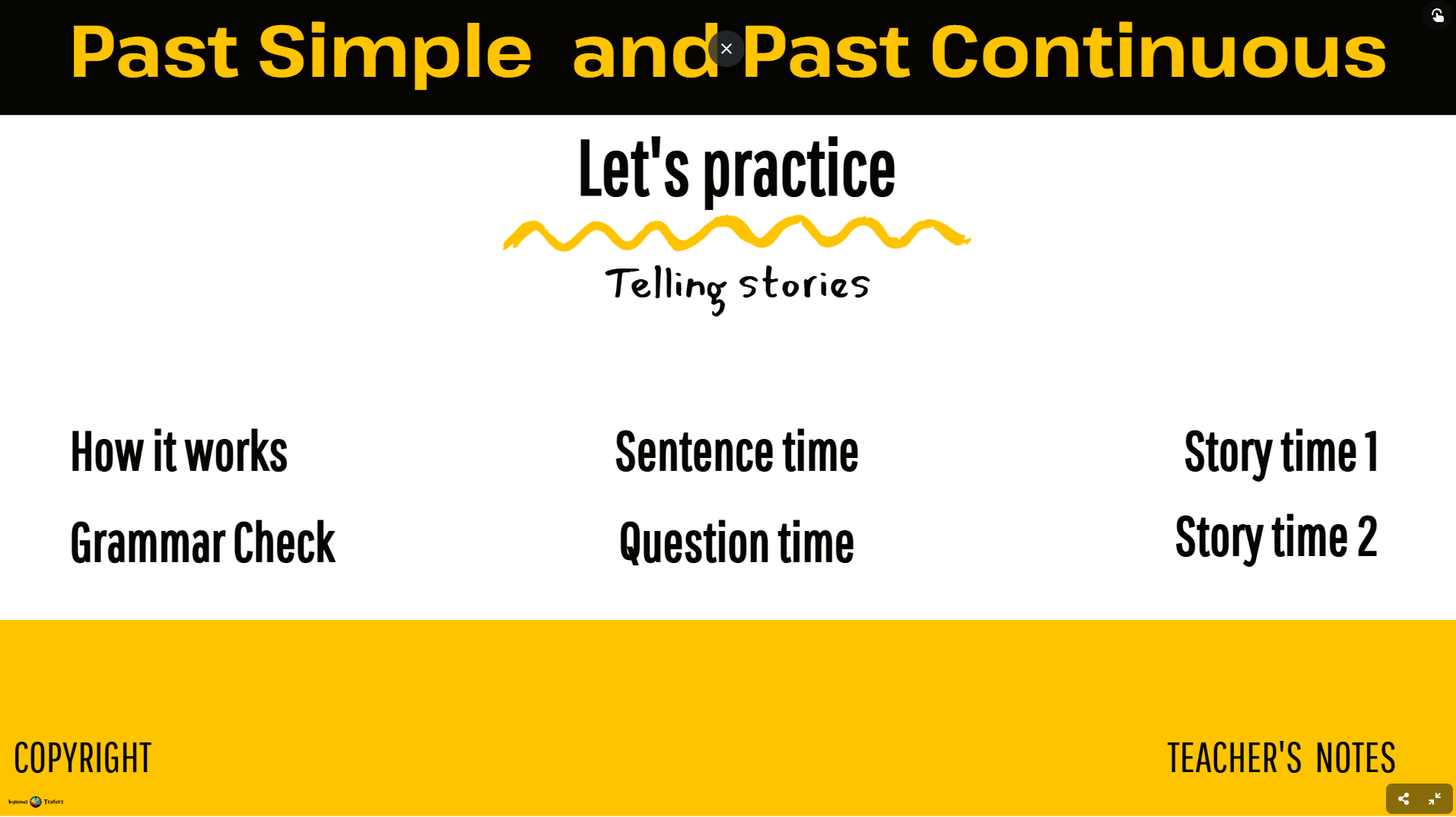 Teach grammar in context, telling stories and describing images. Learn how to effectively use them in practice through multiple context examples. Use our complementary set for Past Simple vs Continuous – learning time to reinforce students’ skills.