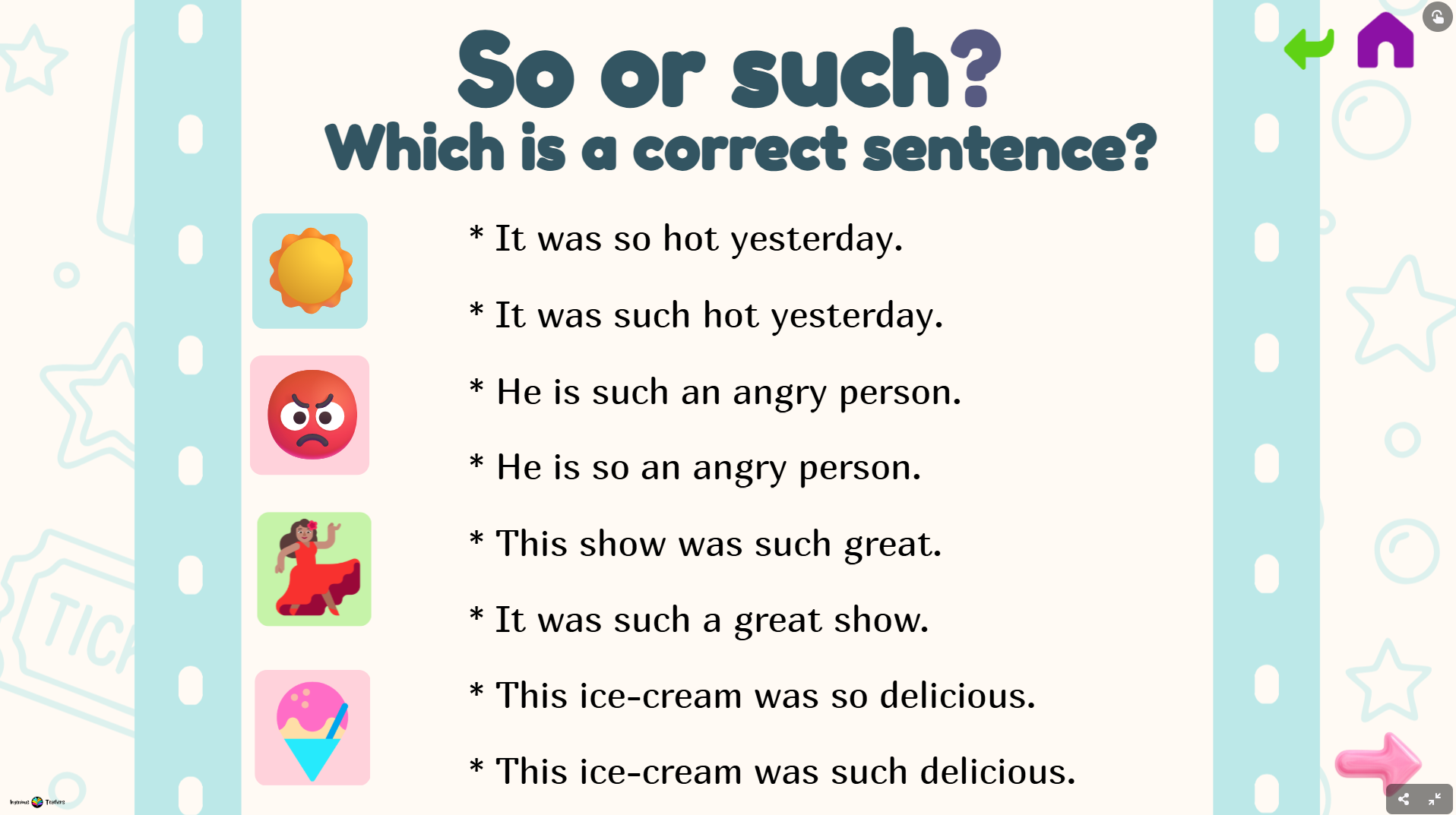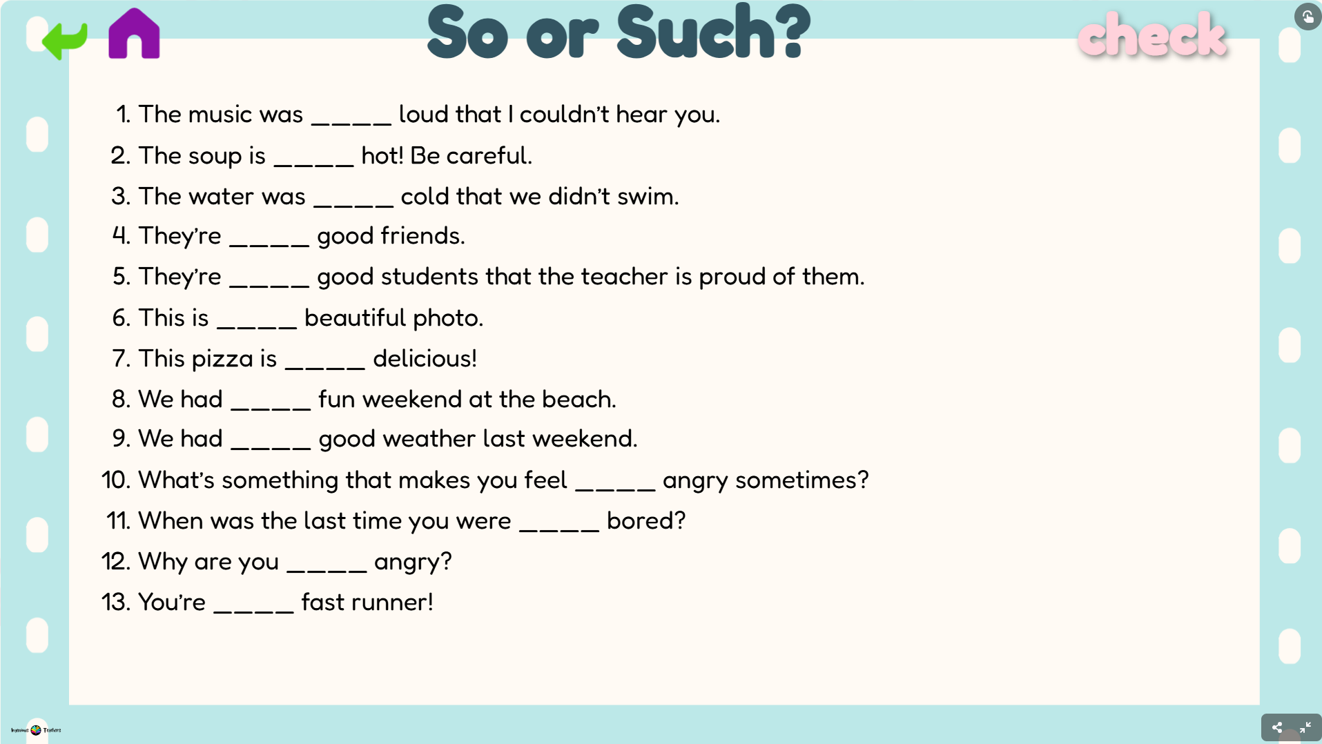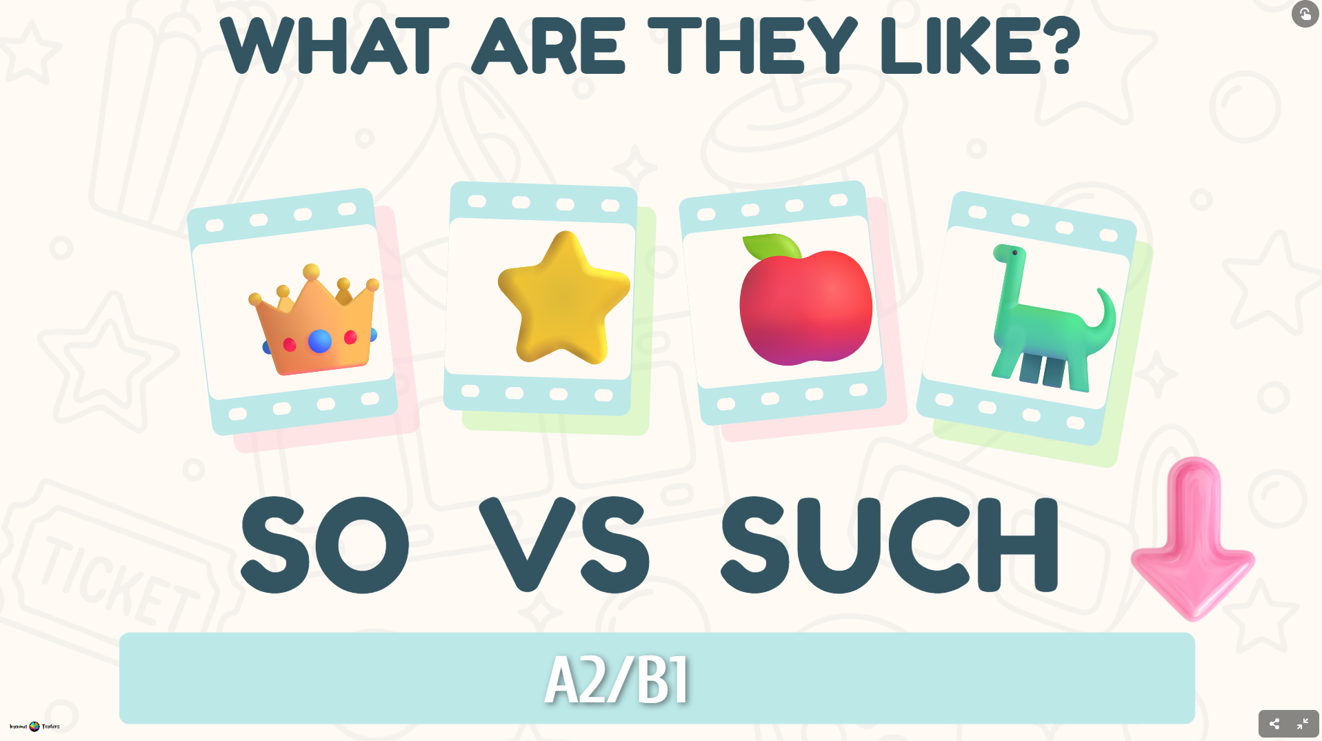 Teach grammar in context, practice problematic expressions in a fun and intuitive way. Here’s a set for a quick but thorough practice of SO and SUCH.