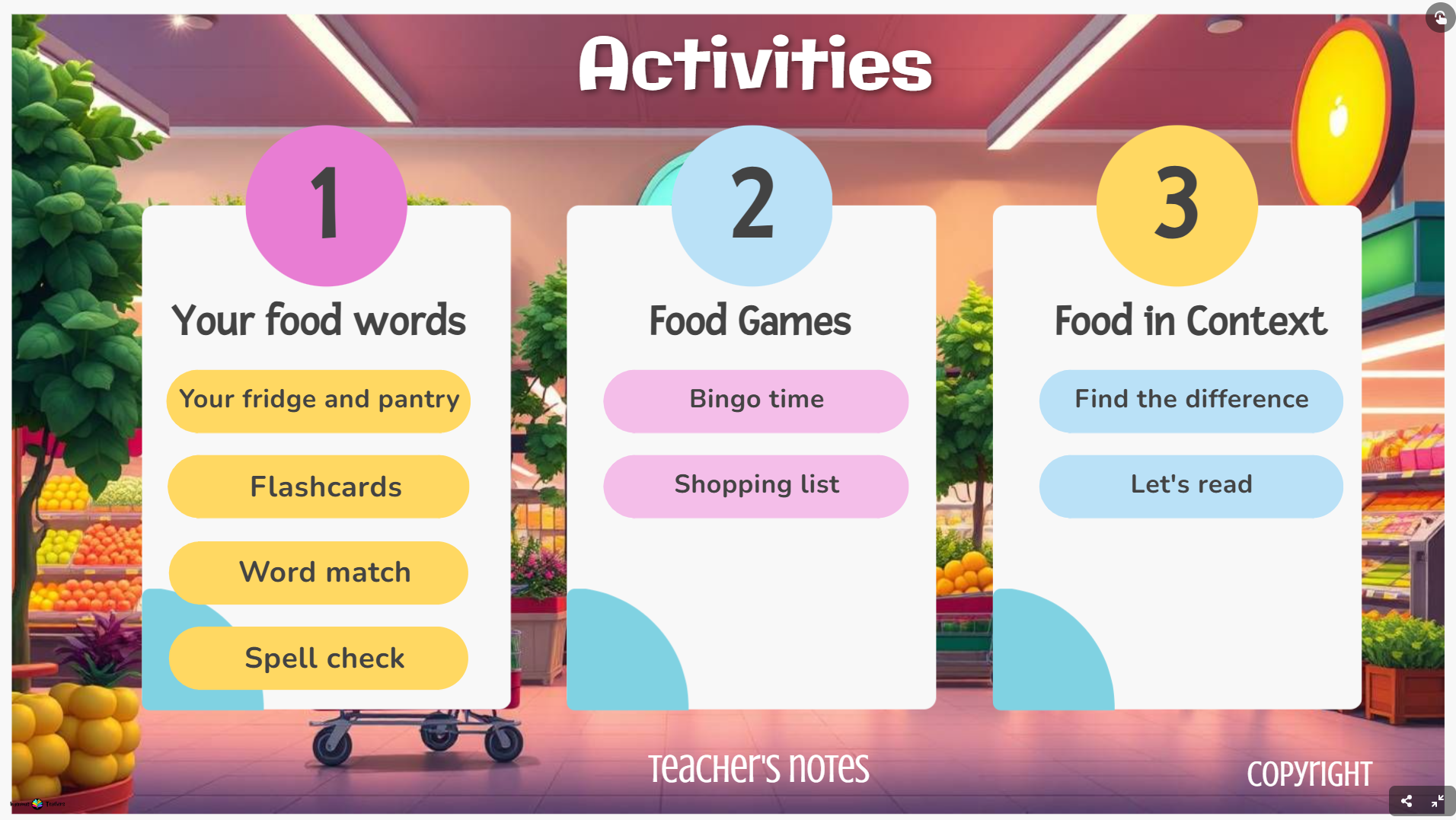Let’s Go Shopping – Learning Time is an interactive language resource designed to introduce, practise, and reinforce food vocabulary and the structures There is / There are through visual, game-based activities.