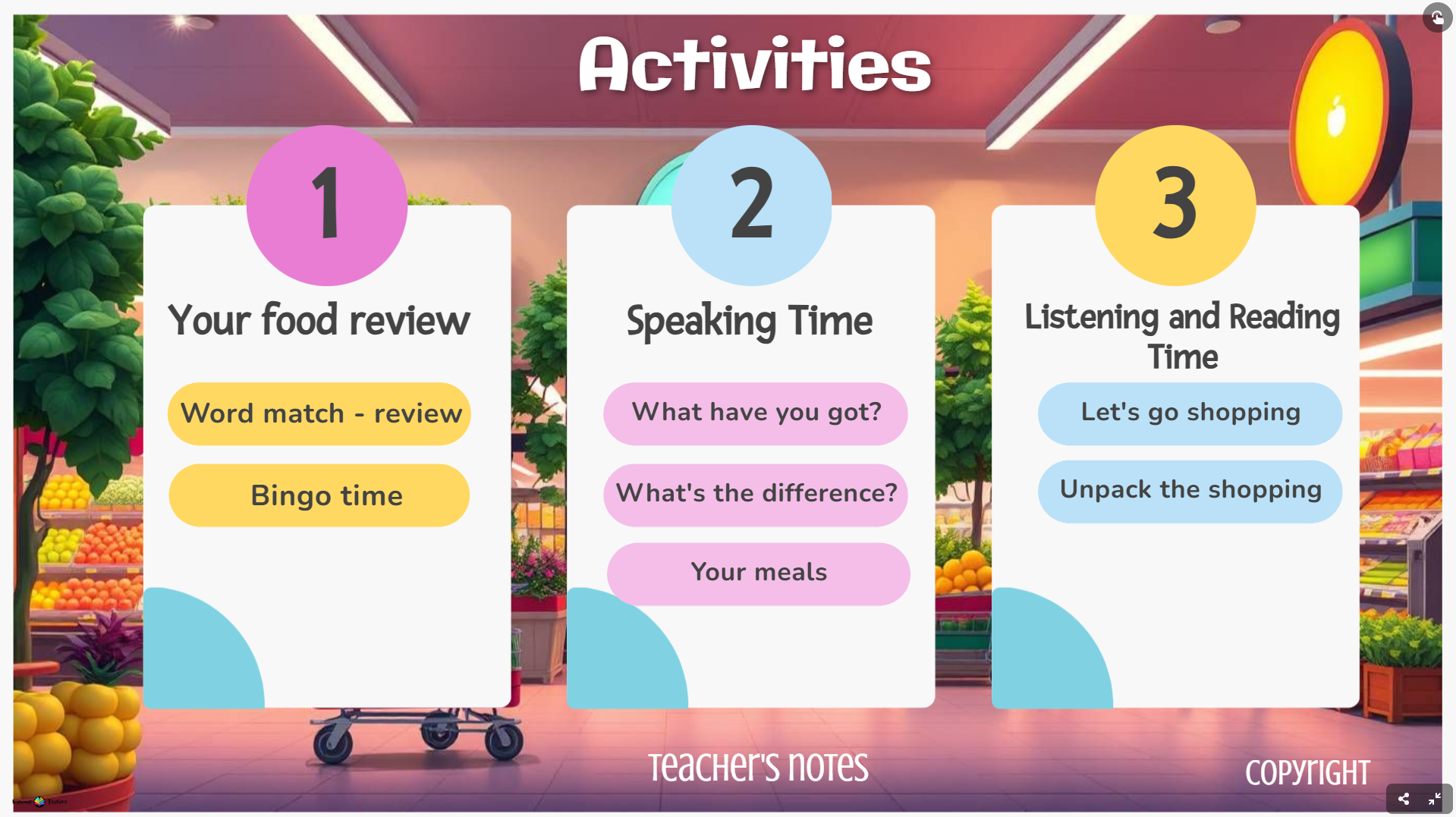 Teach food vocabulary through a rich set of interactive activities that engage students in speaking, listening and reading. This collection offers a complete skills-based lesson where learners explore food items in context, review key grammar, and practise language through games, pairwork, and self-checking tasks.